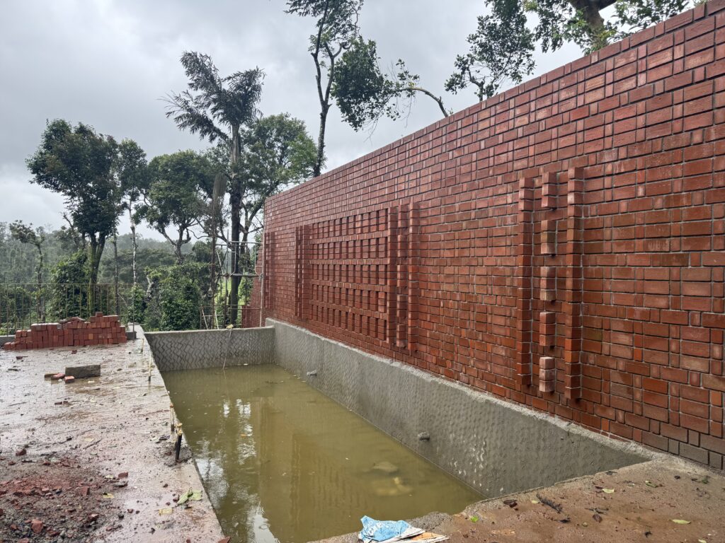 - Architecturally designed exposed brick clubhouse in Sakleshpur blending natural materials with modern construction techniques.