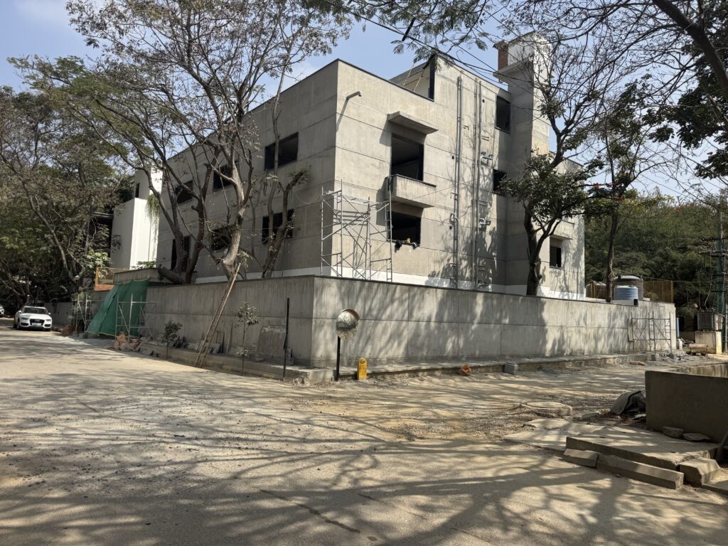 - Modern exposed concrete residential building in Sarjapur Road designed with durable structural engineering and contemporary architecture.